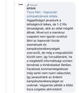 Erre másnap felébredt Lengyel Tíciánó és a „Tisza Párt – Kaposvári szimpatizánsok” nevű oldal, amit ő működtet hónapok óta ingyen, hétvégén, szigetek szervezésével, moderálással, mindenféle hivatalos munkával. A válasz nem késett: „Miért nem hozzánk posztoltad?” „Miért szívod el a munkánkat?” „Miért nem egyeztetsz a hivatalos helyi csapattal?” A kommentekben persze azonnal előjöttek a munkakerülők is: a két női jelölt, Lőrincz Viktória és Palacskó Lászlóné ismét megkapta a magáét. „Kvóta”, „nincs programjuk”, „csak azért vannak, mert nők” – a szokásos panelek, amiket már rutinból copy-paste-elnek bizonyos körök.