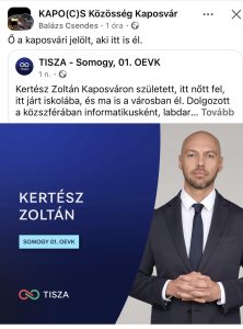 Van egy különös bája annak, ahogy a héten teljesen szétszakadt a helyi Tisza-tábor egy ártatlannak tűnő Facebook-poszt miatt. Csendes Balázs lelkesen kirakta Kertész Zoltán bemutatkozását („informatikus, ex-játékvezető, helyi arc – szavazzatok rá!”), csakhogy a szöveg olyan üres, hogy abban semmi program, semmi tűz, semmi kaposvári kötődés nincs. Egy nagy nulla az egész.
